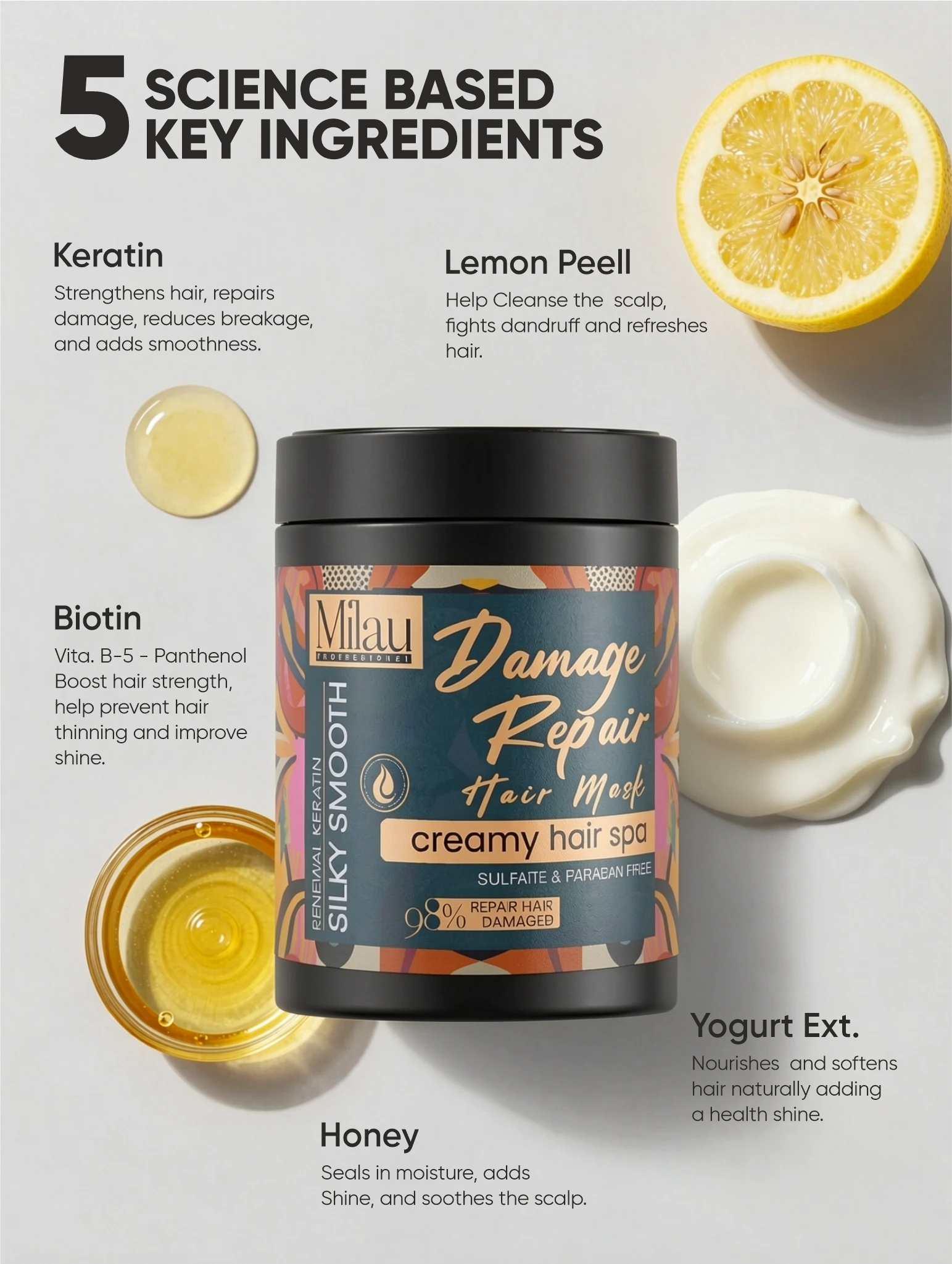 For the most complete at-home keratin repair system: Use this mask weekly as your pre-shampoo dry-hair treatment (30–45 min). Follow with the Milau Keratin Protein Hair Spa Shampoo — its hydrolysed keratin continues the repair through the wash. Finish with the Milau Keratin Protein Hair Spa Conditioner Mask on lengths and ends to seal the repair and deliver the final smooth, shiny result. All three products work through the same keratin repair pathway — weekly pre-treatment mask + wash-day shampoo and conditioner = compounding repair results that visibly transform even severely damaged hair within 4–6 weeks.
