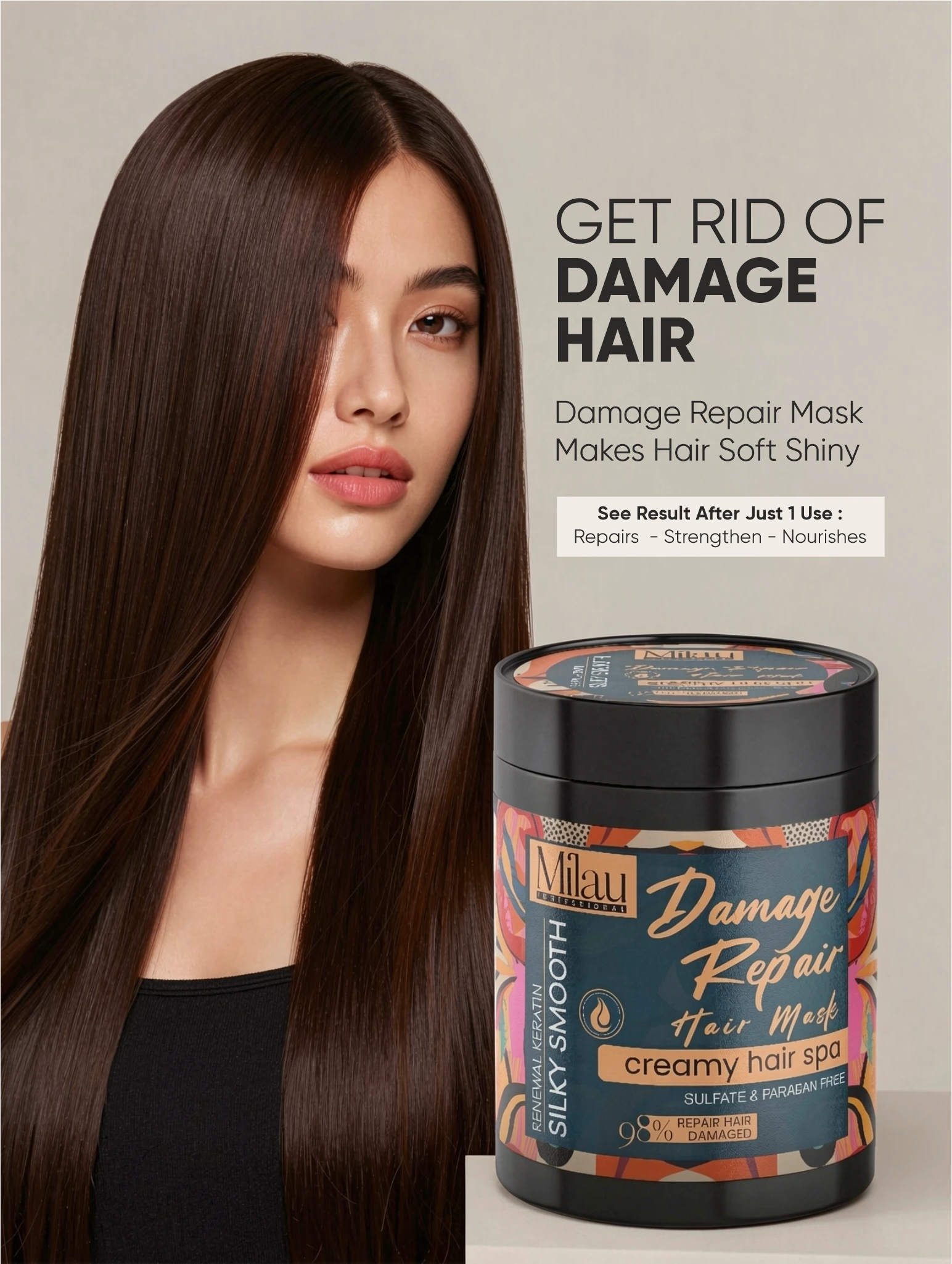 Some hair damage goes beyond what a shampoo or rinse-off conditioner can fix. The Milau Damage Repair Hair Mask with Renewal Keratin exists for exactly this hair — the hair that has been heat-processed, chemically treated, bleached, coloured or simply subjected to years of daily mechanical stress without adequate repair. This is the professional-grade deep keratin repair treatment that rebuilds hair from the inside out — a creamy hair spa mask designed to be used as a pre-shampoo treatment on dry hair for maximum penetration and 98% damage repair efficacy.