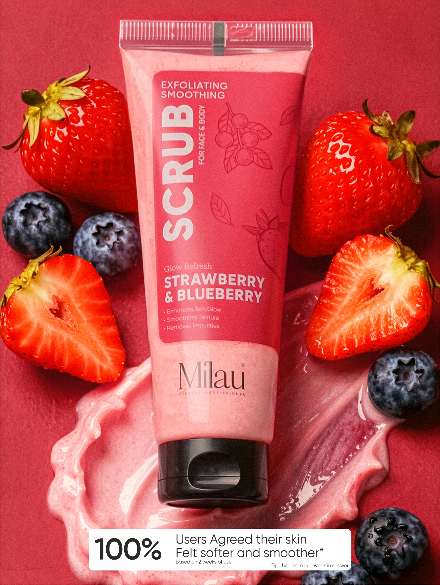 Meet your skin’s new best friend in the shower. The Milau Strawberry & Blueberry Glow Refresh Scrub is a fruit-powered antioxidant body scrub that does what no ordinary cleanser can — it fights the invisible damage building up on your skin every single day while polishing away the dullness that’s been stealing your glow.