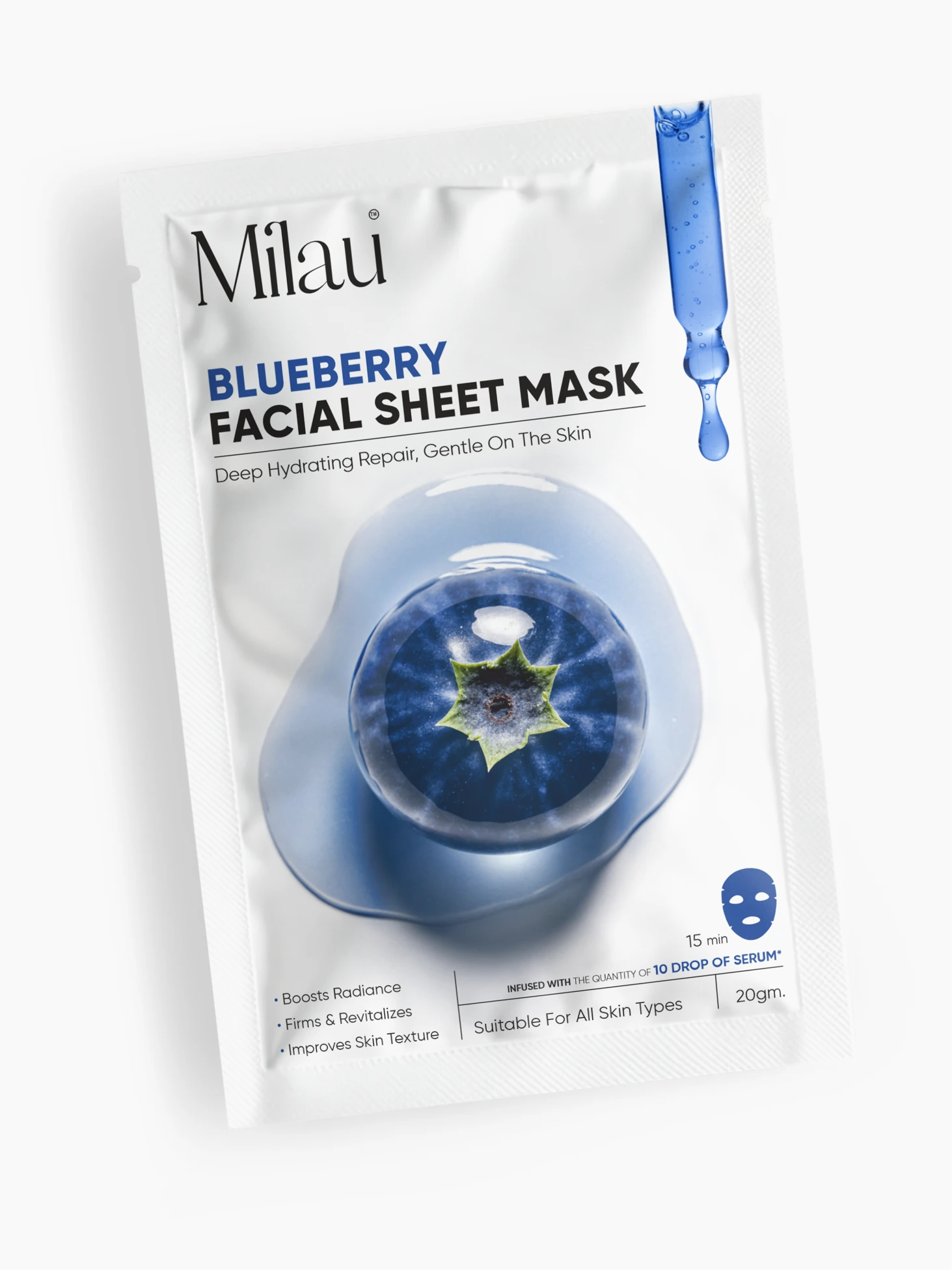 Blueberries contain more antioxidants per gram than almost any other food on Earth. And in skincare, antioxidants are not a wellness trend — they are a biological necessity. Every hour your skin is exposed to daylight, free radicals generated by UV radiation, pollution, blue light and environmental stress are attacking your skin cells — breaking down collagen, triggering inflammatory pigmentation, degrading the skin barrier and accelerating the visible signs of ageing. Antioxidants are the only defence. The Milau Blueberry Facial Sheet Mask delivers 10 drops of concentrated blueberry antioxidant serum directly into your skin in 15 minutes — building the most potent antioxidant defence layer available in a sheet mask format.